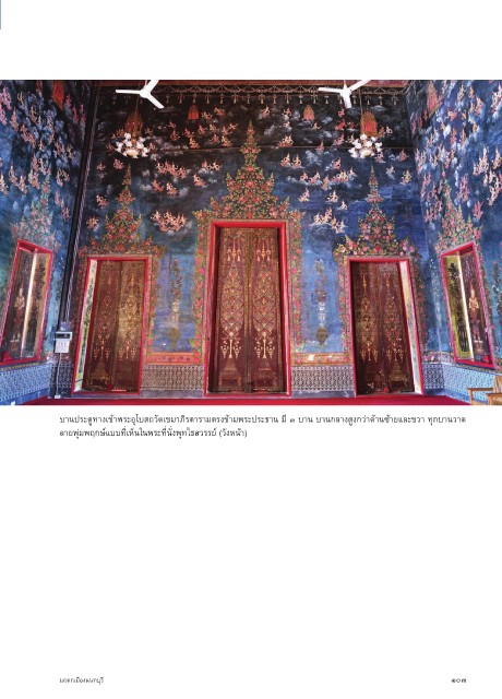 บานประตูทางเข้าพระอุโบสถวัดเขมาภิรตารามตรงข้ามพระประธาน มี ๓ บาน บานกลางสูงกว่าด้านซ้ายและขวา ทุกบานวาด ลายพุ่มพฤกษ์แบบที่เห็นในพระที่นั่งพุทไธสวรรย์ (วังหน้า) มฤดกเมืองนนทบุรี ๑๐๓
