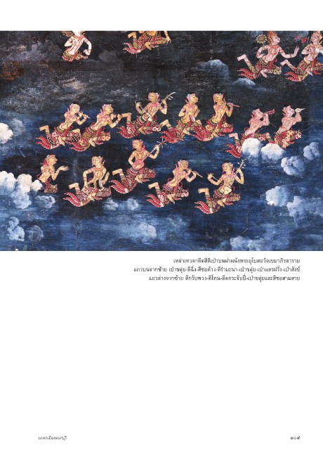 เหล่าเทวดาดีดสีตีเป่าบนฝาผนังพระอุโบสถวัดเขมาภิรตาราม แถวบนจากซ้าย เป่าขลุ่ย-ตีฉิ่ง-สีซอด้วง-ตีรำามะนา-เป่าขลุ่ย-เป่าแตรฝรั่ง-เป่าสังข์ แถวล่างจากซ้าย ตีกรับพวง-ตีโทน-ดีดกระจับปี่-เป่าขลุ่ยและสีซอสามสาย มฤดกเมืองนนทบุรี ๑๐๙