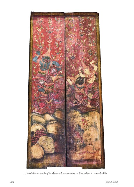 บ�นหน้�ต่�งและบ�นประตูวัดโพธิ์บ�งโอ เขียนภ�พทว�รบ�ล เป็นภ�พจับระหว่�งพระ-ยักษ์-ลิง ๑๒๒ มฤดกเมืองนนทบุรี
