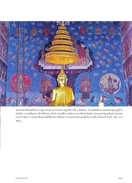 พระประธ�นในโบสถ์วัดเก�ะพญ�เจ่ง มีภ�พว�ดประม�ณยุครัชก�ลที่ ๓ สีสดสวย ด้�นหลังเขียนภ�พเข�พระสุเมรุอยู่ด้�น