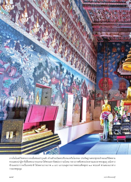 ซ้�ยและขว�ว�ดเรื่องทศช�ติ ใต้เพด�นว�ดภ�พ ๓ แถว แถวบนสุดว�ดภ�พพระอดีตพุทธ ๒๗ พระองค์ ส่วนสองแถวล่�ง