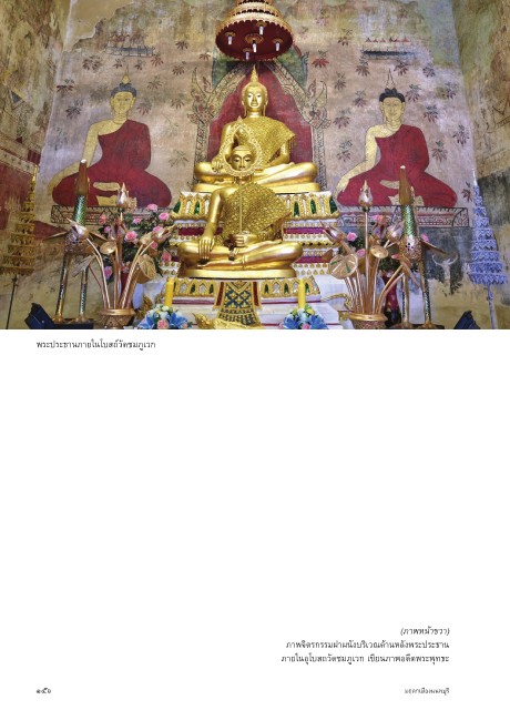 พระประธ�นภ�ยในโบสถ์วัดชมภูเวก (ภาพหน้าขวา) ภ�พจิตรกรรมฝ�ผนังบริเวณด้�นหลังพระประธ�น ภ�ยในอุโบสถวัดชมภูเวก เขียนภ�พอดีตพระพุทธะ ๑๕๖ มฤดกเมืองนนทบุรี