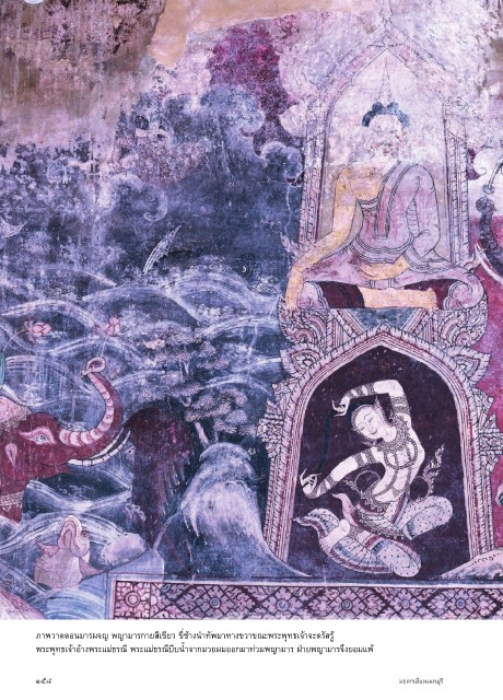ภ�พว�ดตอนม�รผจญ พญ�ม�รก�ยสีเขียว ขี่ช้�งนำ�ทัพม�ท�งขว�ขณะพระพุทธเจ้�จะตรัสรู้ พระพุทธเจ้�อ้�งพระแม่ธรณี พระแม่ธรณีบีบนำ้�จ�กมวยผมออกม�ท่วมพญ�ม�ร ฝ่�ยพญ�ม�รจึงยอมแพ้ ๑๕๘ มฤดกเมืองนนทบุรี