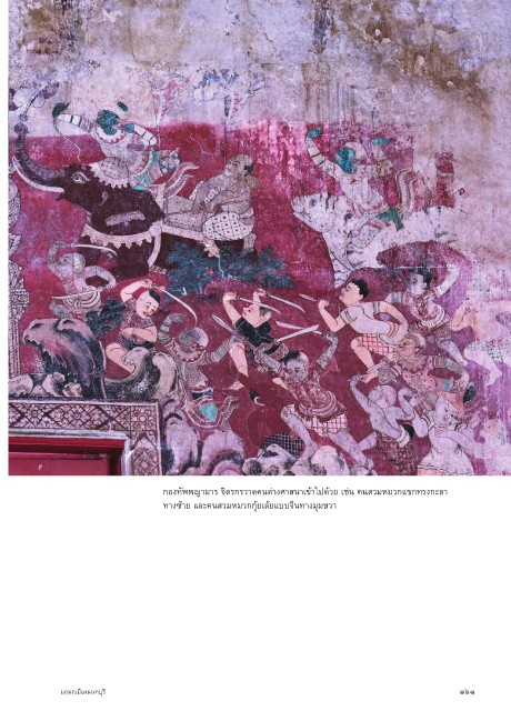 กองทัพพญ�ม�ร จิตรกรว�ดคนต่�งศ�สน�เข้�ไปด้วย เช่น คนสวมหมวกแขกทรงกะล� ท�งซ้�ย และคนสวมหมวกกุ้ยเล้ยแบบจีนท�งมุมขว� มฤดกเมืองนนทบุรี ๑๖๑