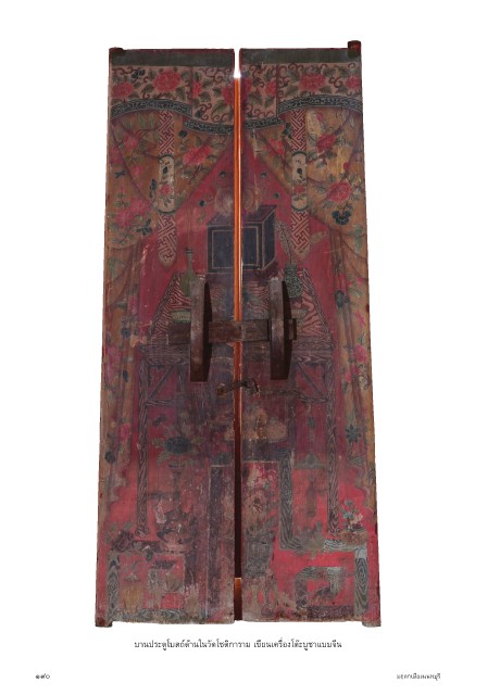 บ�นประตูโบสถ์ด้�นในวัดโชติก�ร�ม เขียนเครื่องโต๊ะบูช�แบบจีน ๑๙๐ มฤดกเมืองนนทบุรี