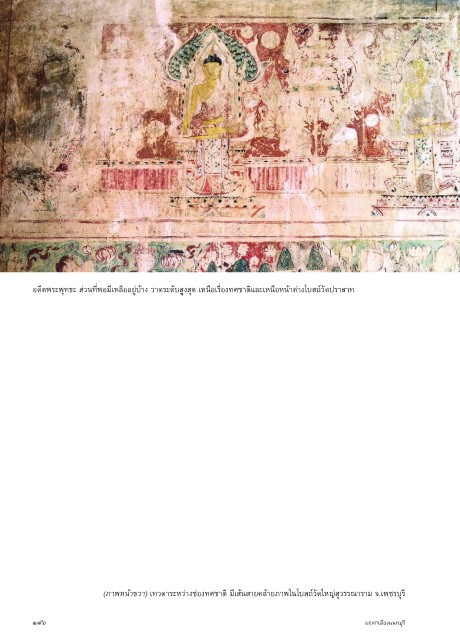 อดีตพระพุทธะ ส่วนที่พอมีเหลืออยู่บ้�ง ว�ดระดับสูงสุด เหนือเรื่องทศช�ติและเหนือหน้�ต่�งโบสถ์วัดปร�ส�ท (ภาพหน้าขวา) เทวด�ระหว่�งช่องทศช�ติ มีเส้นส�ยคล้�ยภ�พในโบสถ์วัดใหญ่สุวรรณ�ร�ม จ.เพชรบุรี ๑๙๖ มฤดกเมืองนนทบุรี