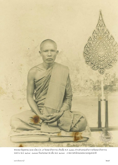 พระเขมาภิมุขธรรม (นวล ยโส) ป.ธ. ๕ วัดเขมาภิรตาราม เกิดเมื่อ พ.ศ. ๒๔๒๖ ดำารงตำาแหน่งเจ้าอาวาสวัดเขมาภิรตาราม ระหว่าง พ.ศ. ๒๔๖๔ - ๒๔๗๗ ถึงแก่มรณภาพ เมื่อ พ.ศ. ๒๔๗๗ ภาพจากสำานักหอจดหมายเหตุแห่งชาติ มฤดกเมืองนนทบุรี ๒๑๙