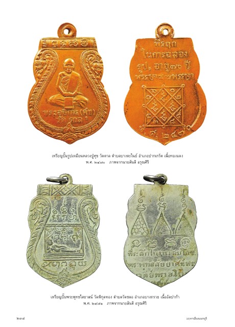 เหรียญปั๊มรูปเหมือนหลวงปู่ศุข วัดตาล ตำาบลบางตะไนย์ อำาเภอปากเกร็ด เนิ้อทองแดง พ.ศ. ๒๔๗๐ ภาพจากนายสันติ อรุณศิริ เหรียญปั๊มพระพุทธไสยาสน์ วัดพิกุลทอง ตำาบลวัดชลอ อำาเภอบางกรวย เนื้ออัลปาก้า พ.ศ. ๒๔๗๑ ภาพจากนายสันติ อรุณศิริ ๒๓๘ มฤดกเมืองนนทบุรี