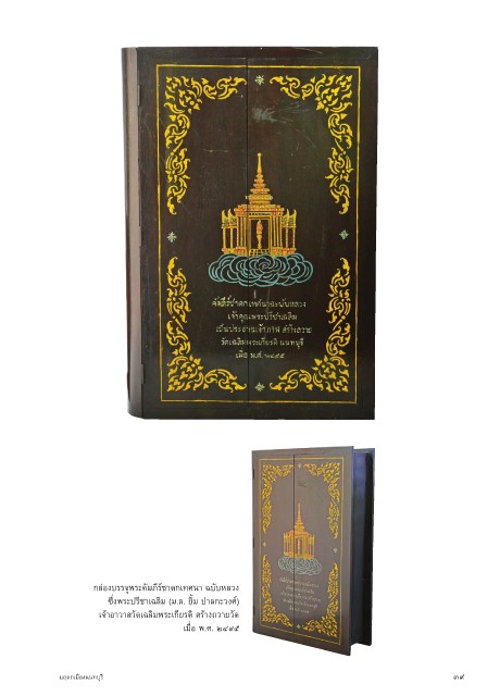 กล่องบรรจุพระคัมภีร์ช�ดกเทศน� ฉบับหลวง ซึ่งพระปรีช�เฉลิม (ม.ล. ยิ้ม ป�ลกะวงศ์) เจ้�อ�ว�สวัดเฉลิมพระเกียรติ สร้�งถว�ยวัด เมื่อ พ.ศ. ๒๔๙๕ มฤดกเมืองนนทบุรี ๓๙