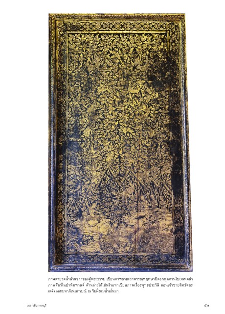 ภ�พล�ยรดนำ้�ด้�นขว�ของตู้พระธรรม เขียนภ�พล�ยเถ�พรรณพฤกษ�มีดอกพุดต�นใบเทศเคล้� ภ�พสัตว์ในป่�หิมพ�นต์ ด้�นล่�งใต้เส้นสินเท�เขียนภ�พเรื่องพุทธประวัติ ตอนเจ้�ช�ยสิทธัตถะ เสด็จออกมห�ภิเนษกรมณ์ ณ ริมฝั่งแม่นำ้�อโนม� มฤดกเมืองนนทบุรี ๕๓