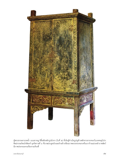 ตู้พระธรรมล�ยรดนำ้� แบบข�หมู มีลิ้นชักสลักรูปมังกร (ใบที่ ๕) ที่เชิงตู้ทำ�เป็นรูปหูช้�งสลักล�ยกระหนกใบเทศฉลุโปร่ง