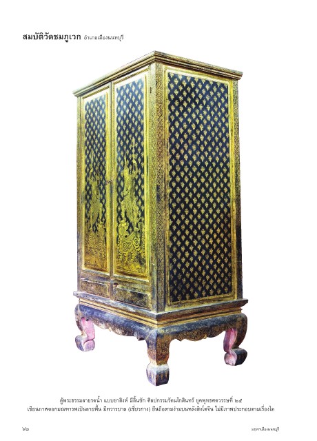 สมบัติวัดชมภูเวก อำ�เภอเมืองนนทบุรี ตู้พระธรรมล�ยรดนำ้� แบบข�สิงห์ มีลิ้นชัก ศิลปกรรมรัตนโกสินทร์ ยุคพุทธศตวรรษที่ ๒๕ เขียนภ�พดอกมณฑ�รพเป็นล�ยพื้น มีทว�รบ�ล (เซี่ยวก�ง) ยืนถือส�มง่�มบนหลังสิงโตจีน ไม่มีภ�พประกอบต�มเรื่องใด ๖๒ มฤดกเมืองนนทบุรี