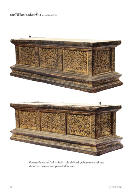 สมบัติวัดบางอ้อยช้าง อำ�เภอบ�งกรวย หีบพระม�ลัยล�ยรดนำ้�ใบที่ ๑ ศิลปกรรมรัตนโกสินทร์ ยุคต้นพุทธศตวรรษที่ ๒๕ เขียนล�ยพรรณพฤกษ�ดอกพุดต�นเป็นพื้นทุกช่อง ๖๖ มฤดกเมืองนนทบุรี