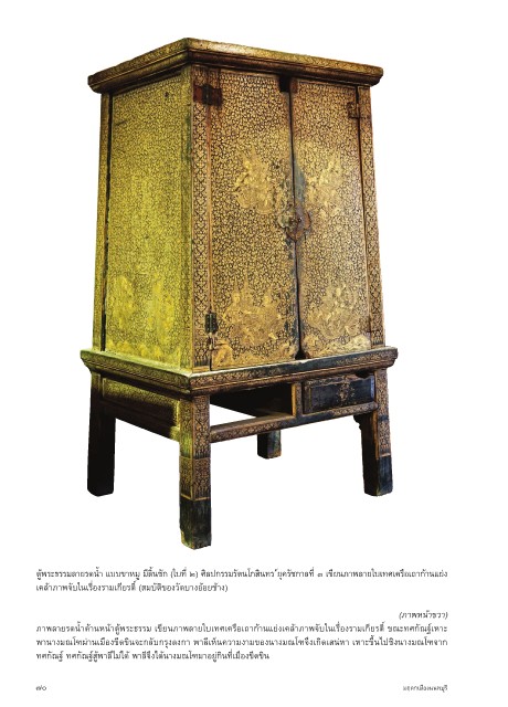 ตู้พระธรรมล�ยรดนำ้� แบบข�หมู มีลิ้นชัก (ใบที่ ๒) ศิลปกรรมรัตนโกสินทร ์ยุครัชก�ลที่ ๓ เขียนภ�พล�ยใบเทศเครือเถ�ก้�นแย่ง