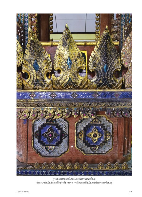 ฐ�นของธรรม�สน์ประดับกระจังรวนขน�ดใหญ่ ถัดลงม�ทำ�เป็นช่วงลูกฟักประดับกระจก ภ�ยในแกะสลักเป็นล�ยประจำ�ย�มซ้อนอยู่ มฤดกเมืองนนทบุรี ๘๙